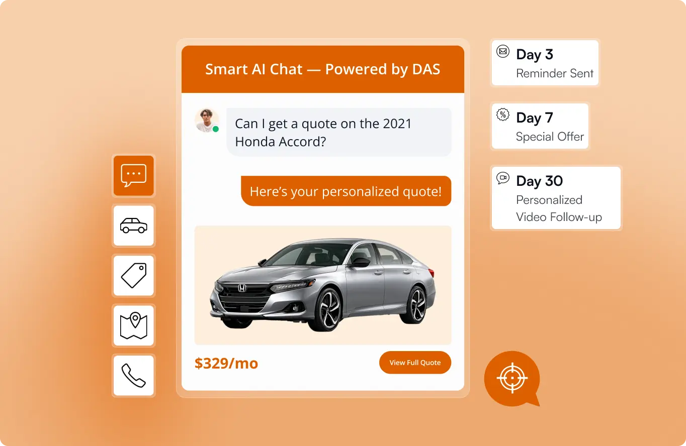 Responds to every internet lead in seconds with multi-vehicle quotes and 180-day nurturing.